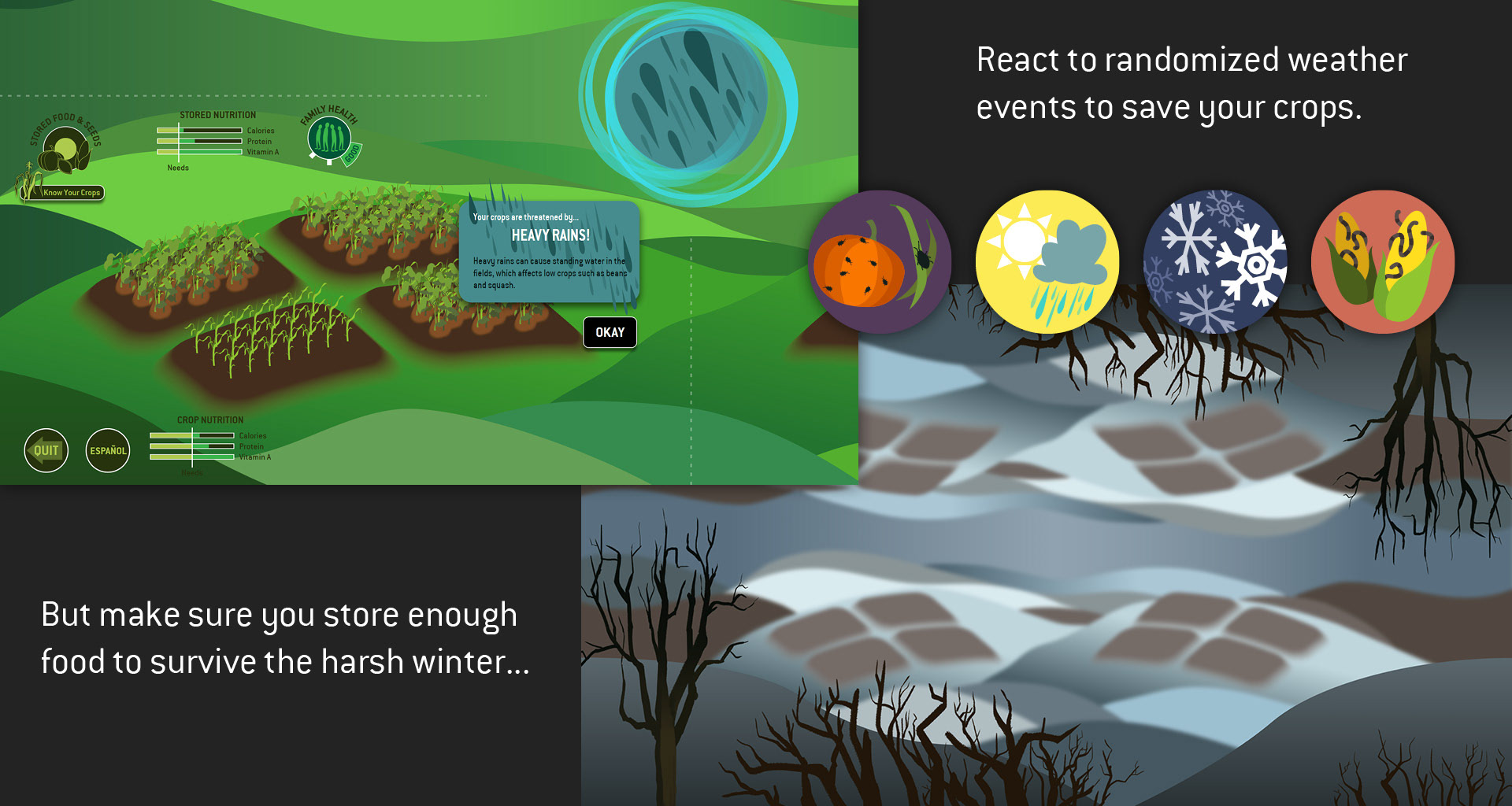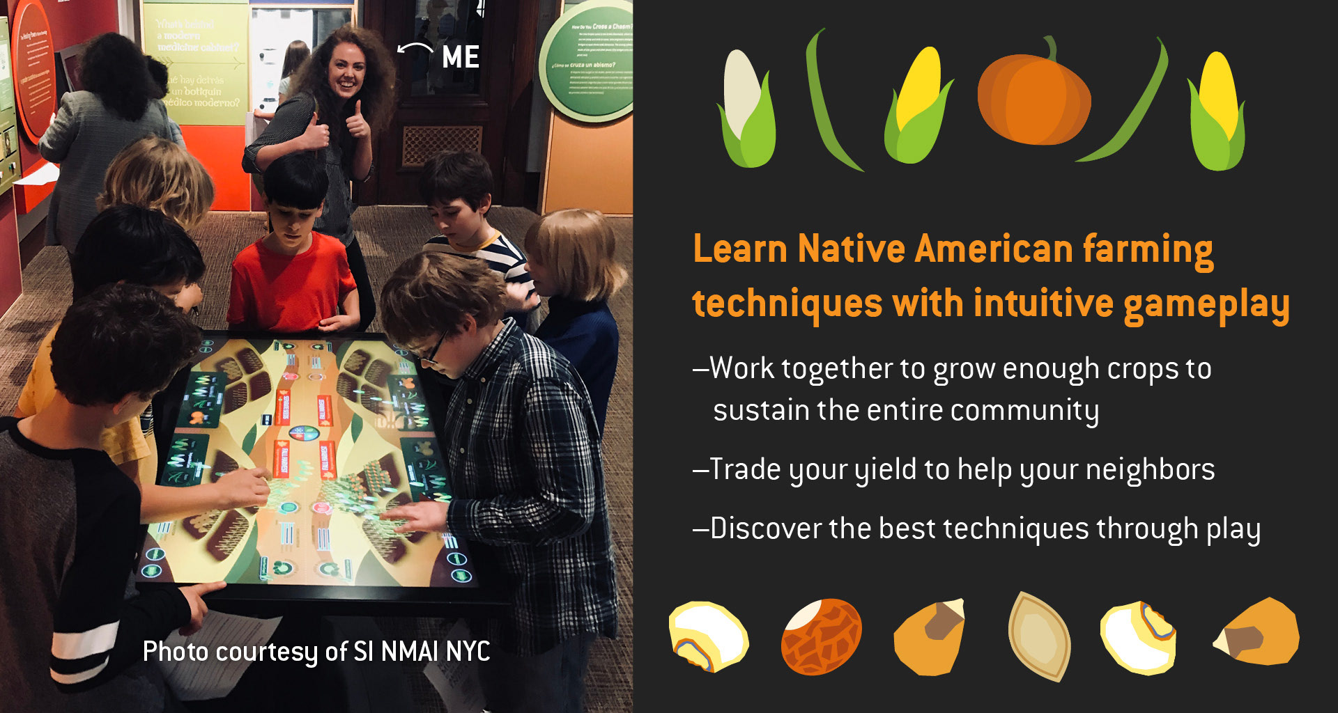 Designed for the Smithsonian Institute's National Museum of the American Indian, Cropetition is a collaborative multi-player game where players learn Native American farming techniques by working together.