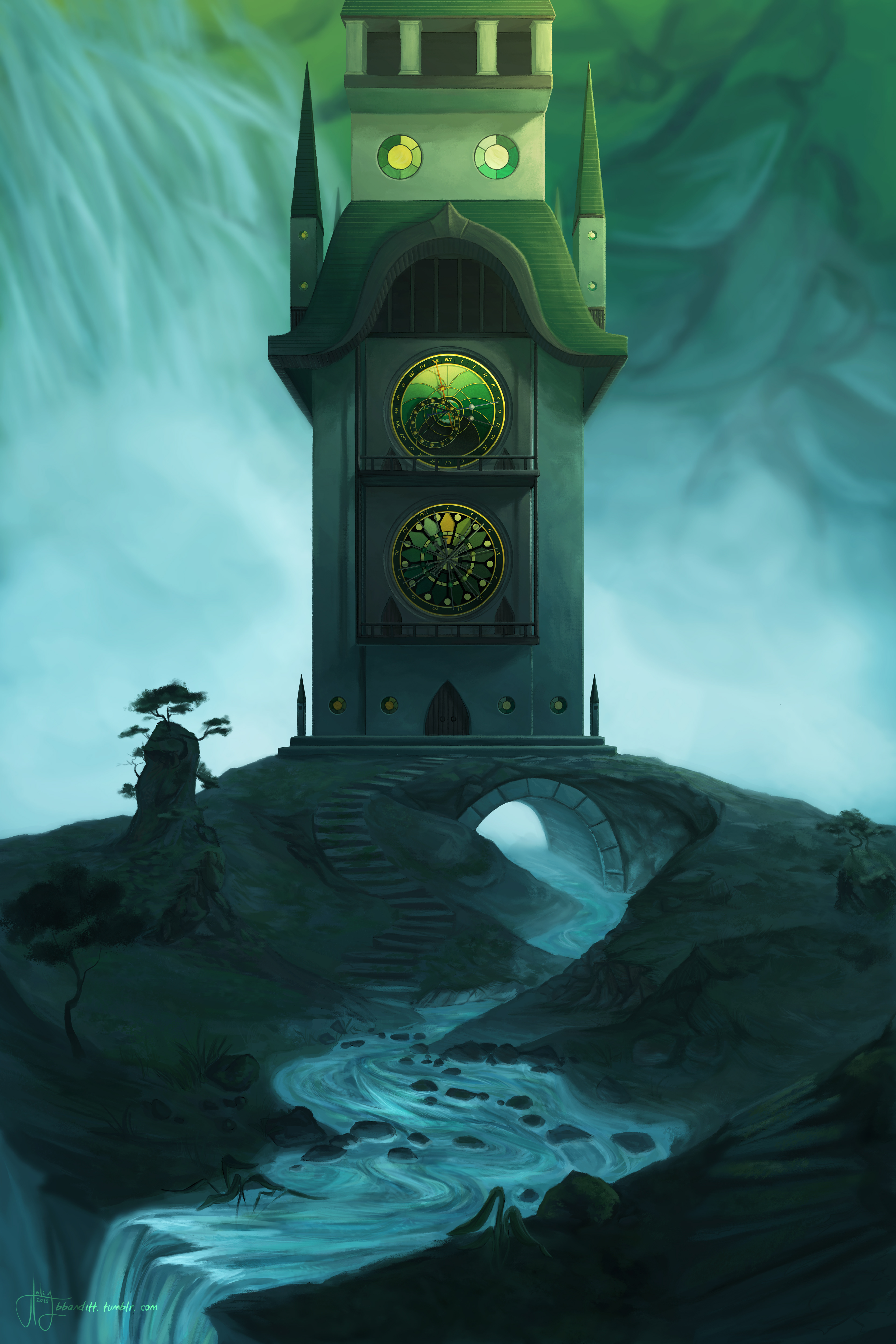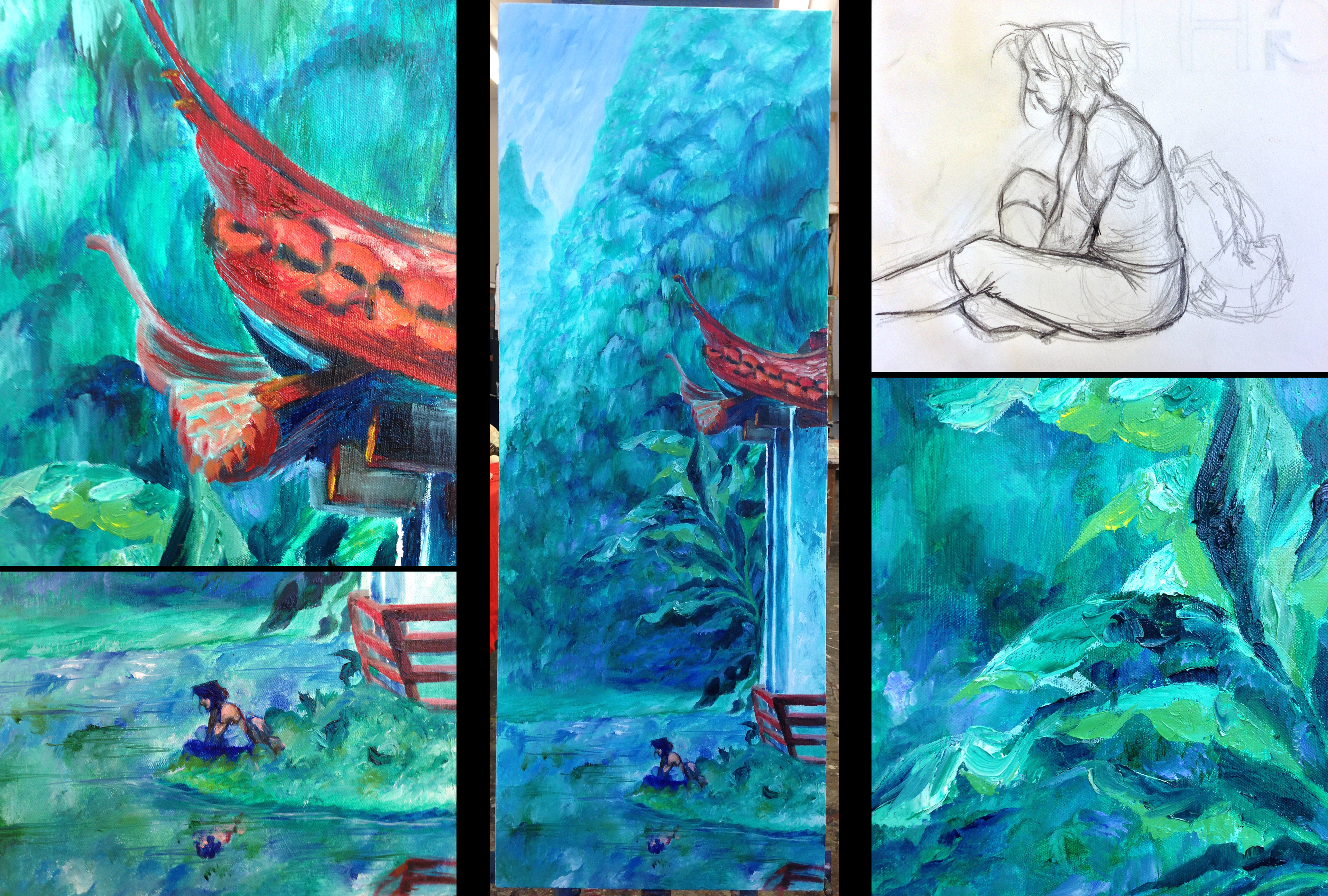 Temple islands location concepts in oil paint and digitally, respectively.