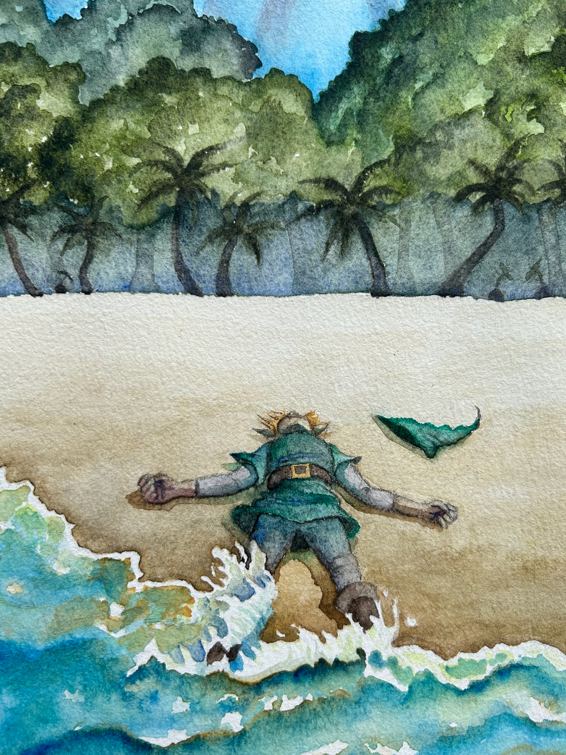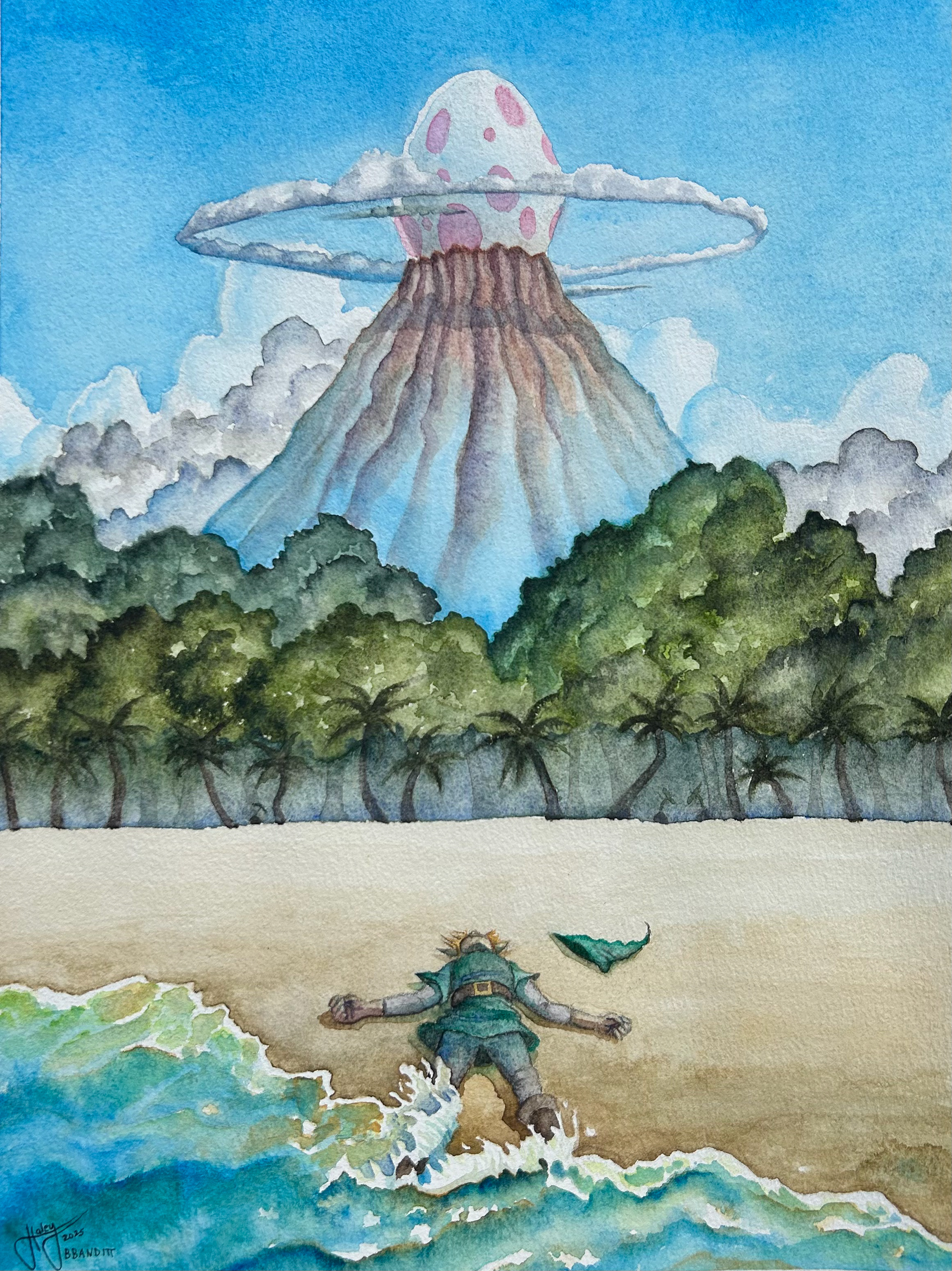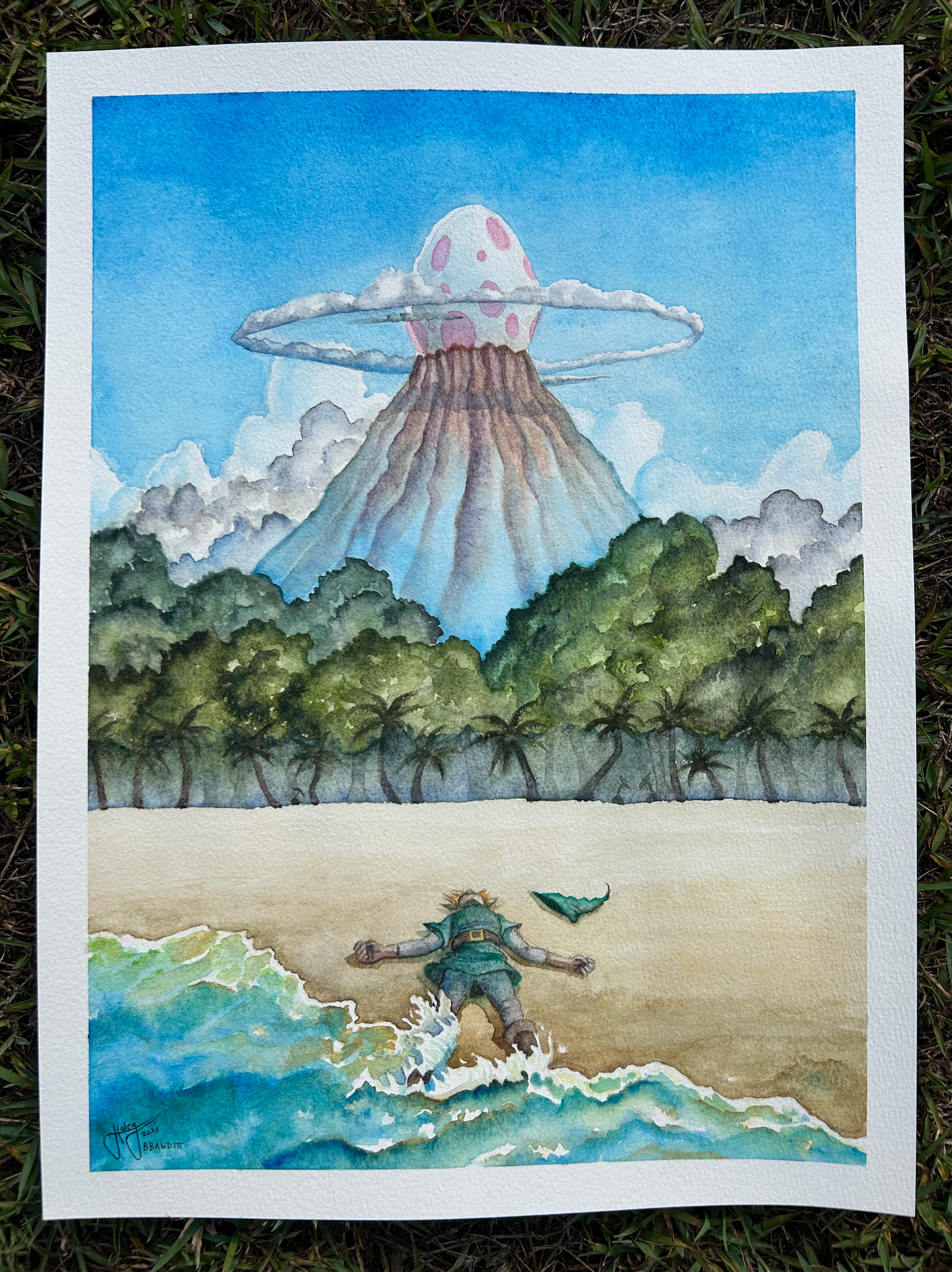 This watercolor painting depicts the opening scene of the game, when Link washes ashore on Koholint Island, with the egg of the Windfish high above.
