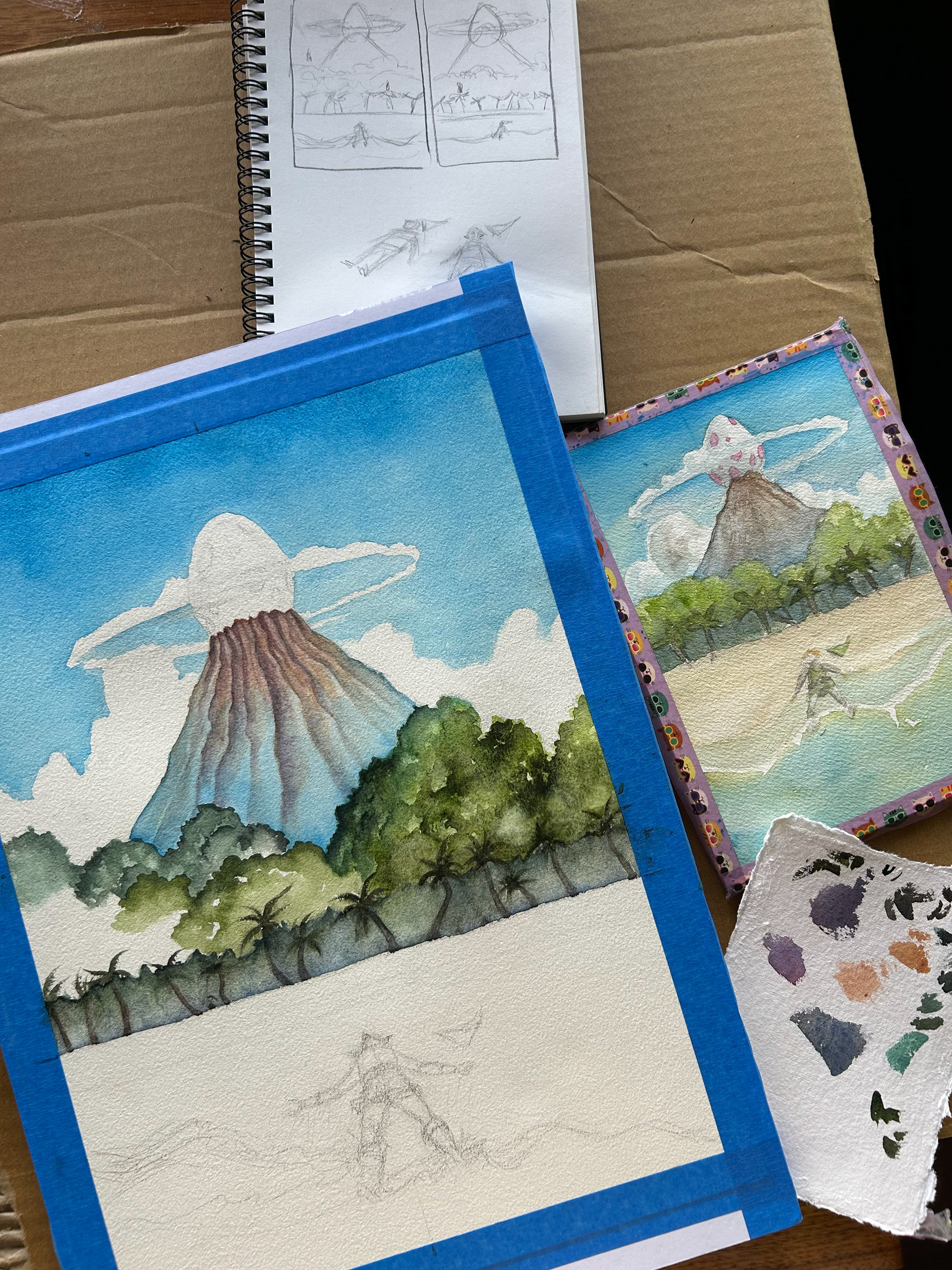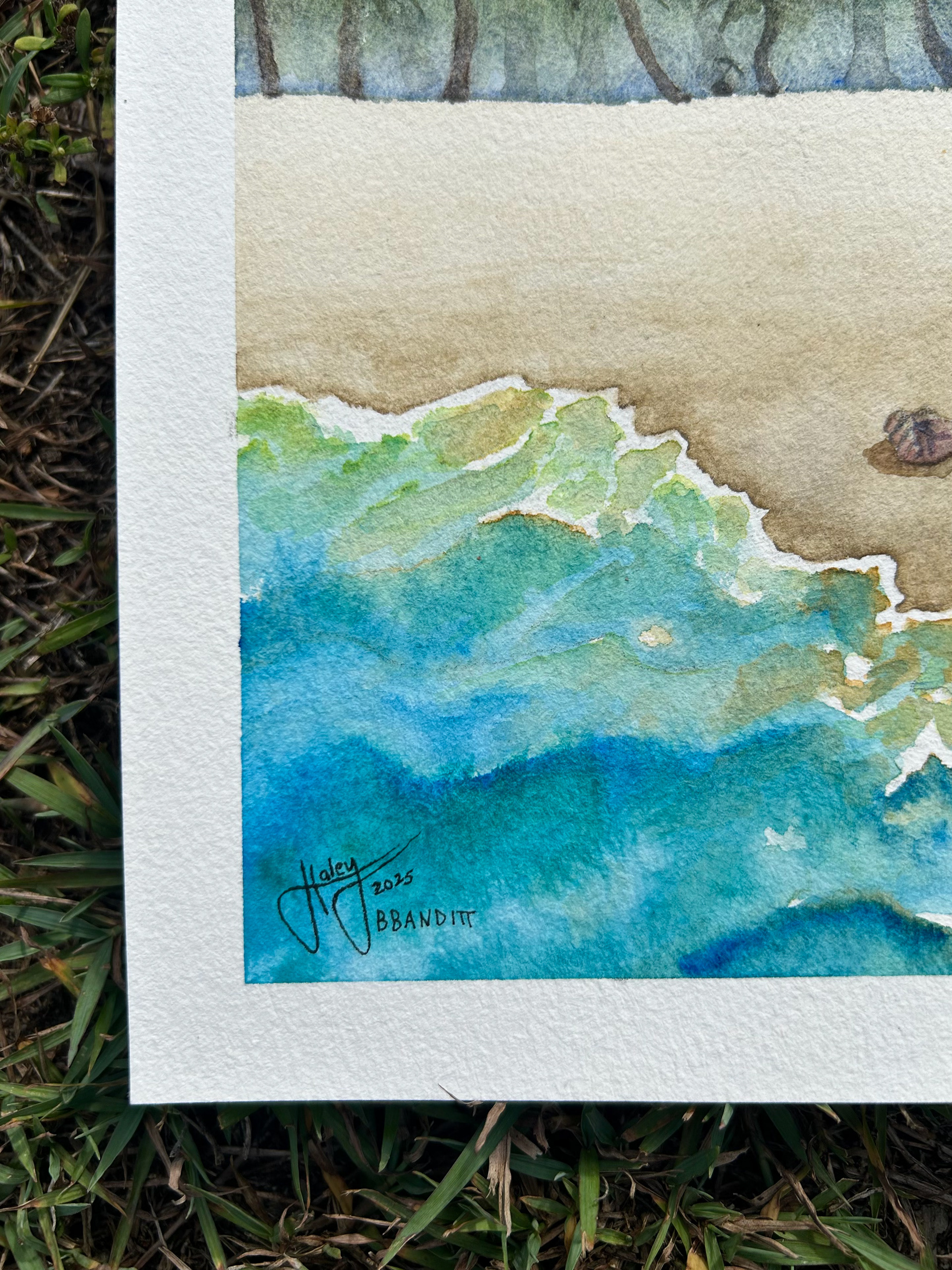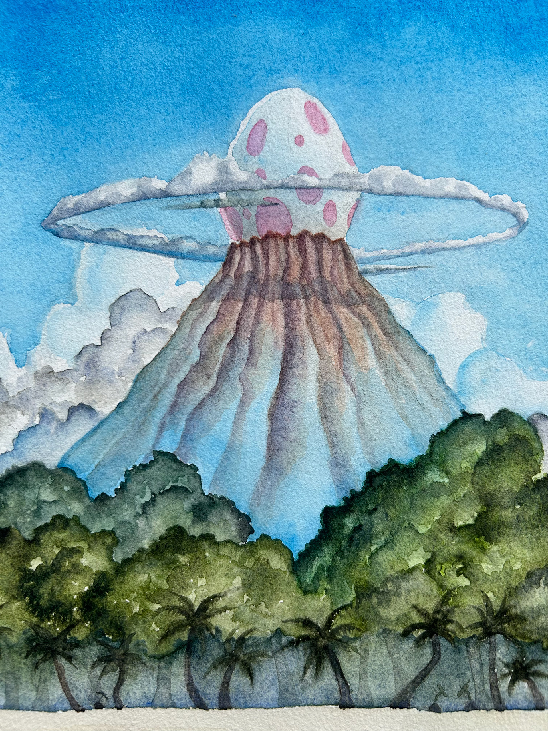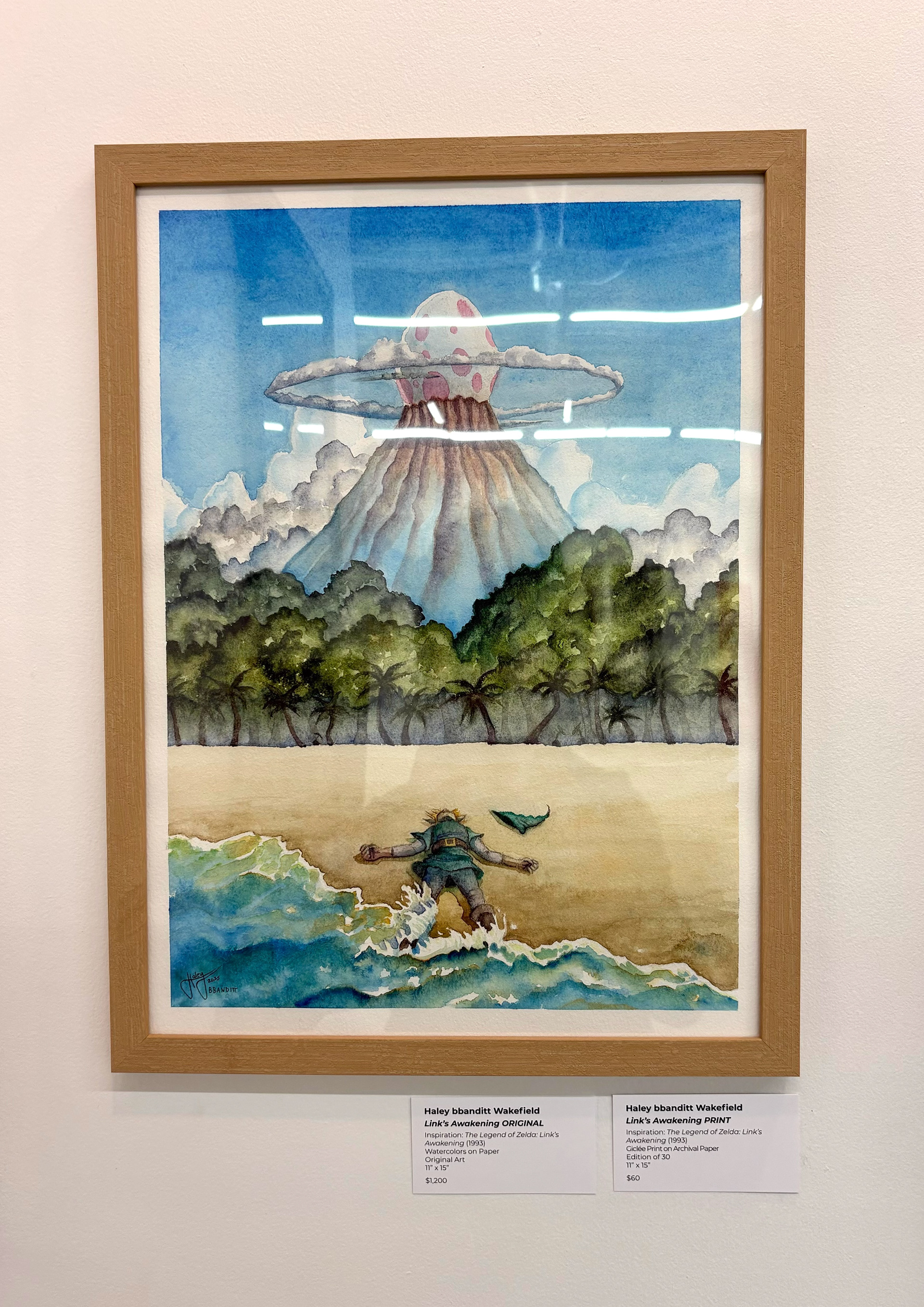 This watercolor painting depicts the opening scene of the game, when Link washes ashore on Koholint Island, with the egg of the Windfish high above.
