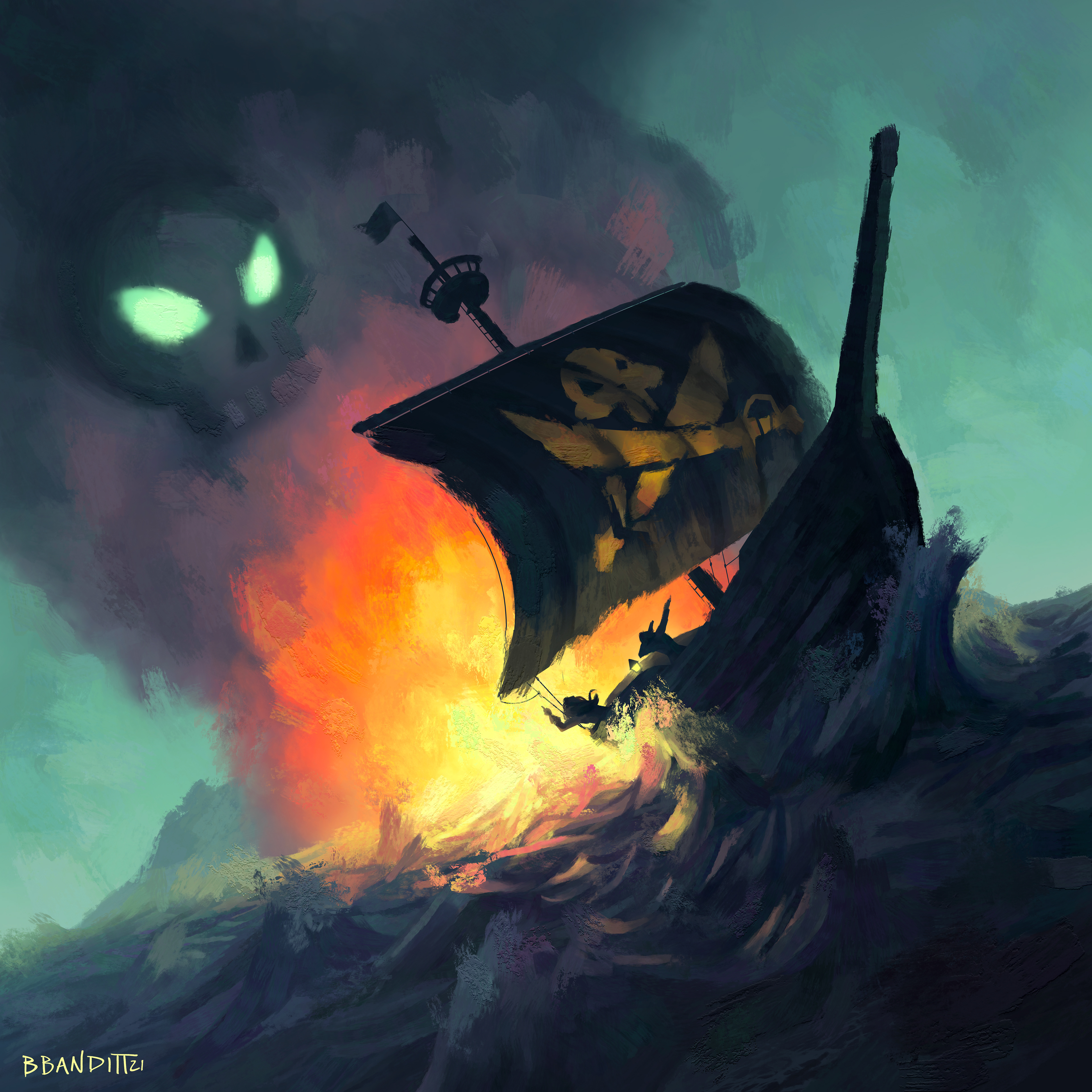 To create concepts for the vinyl soundtrack of Wired Production's The Falconeer, I found the moments in-game that struck a chord with me personally. I chose the most exhilarating part for the cover: soaring straight into the lightning storm, atop the massive falcon that gives the game its name. The dramatic lighting, the brilliant colors, and the swirling mass of clouds are everything that I love to paint; these pieces are just brimming with bold daubs of color and dreamy swirls of the palette knife. Then, for the interior and back cover, we get a taste of the vast breadth of the game. I wanted the artwork to give the viewer that nervous excitement you feel when you discover a new place and descend into unknown territory. I wanted fans to get butterflies in their stomach like they’re diving at top speed toward the sea when they view this soundtrack, with a rush of adrenaline and a burst of unbridled joy.